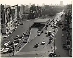 Bus service to Kenmore began in 1933 as replacement for the Ipswich Street line.[15][16] Buses originally stopped at the curb, which required them to cut across multiple lanes of traffic to loop from inbound to outbound. In early 1939, the Chamber of Commerce proposed a busway in the center of the square, with direct access to the station mezzanine below.[17] Mayor Maurice J. Tobin initially supported the plan, but soon refused to allow the city to pay for it.[18][19] The proposal was raised again in 1943, and Tobin awarded a $24,063 contract on June 28.[20][21] The busway, which had a concrete platform and a wooden shelter, opened along with a direct stairway to the mezzanine on November 4, 1943.[22][23]