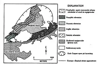 The Bingham Canyon ore deposits occur in the Bingham nappe. They are a porphyry copper deposit, formed by a quartz monzonite porphyry intruded into sedimentary rocks. They exhibit a concentric alteration pattern and mineralogic zonation around the Bingham stock. These zones include a central core containing magnetite, followed by "a molybdenite zone low in copper, a bornite-chalcopyrite-gold higher grade copper zone, a pyrite-chalcopyrite zone, a pyrite zone, and an outermost lead-zinc zone."[18]: E1, E8