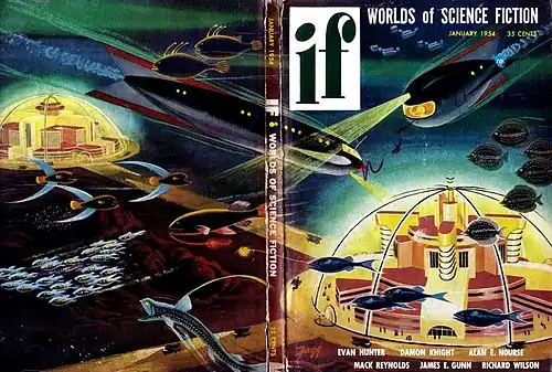 Fagg may be best remembered today for his relatively brief stint providing painted covers for a 1950s science fiction magazine. Recruited by art director Ed Valigursky, he provided the newly published If magazine with a dozen cover paintings in just over two years, part of a run of "stunning covers for If which immediately began to raise its circulation", including "wrap-around covers which remain stunning to this day".[6][1] He also provided covers for three novels in the Winston Science Fiction series.[1] In 2001, a New York Times review of a retrospective exhibition of futuristic art singled out Fagg's cover painting for the January 1954 If, praising its depiction of "a glowing submarine metropolis under interconnected glass domes, painted in a cheerfully colorful, cartoonish style".[7]