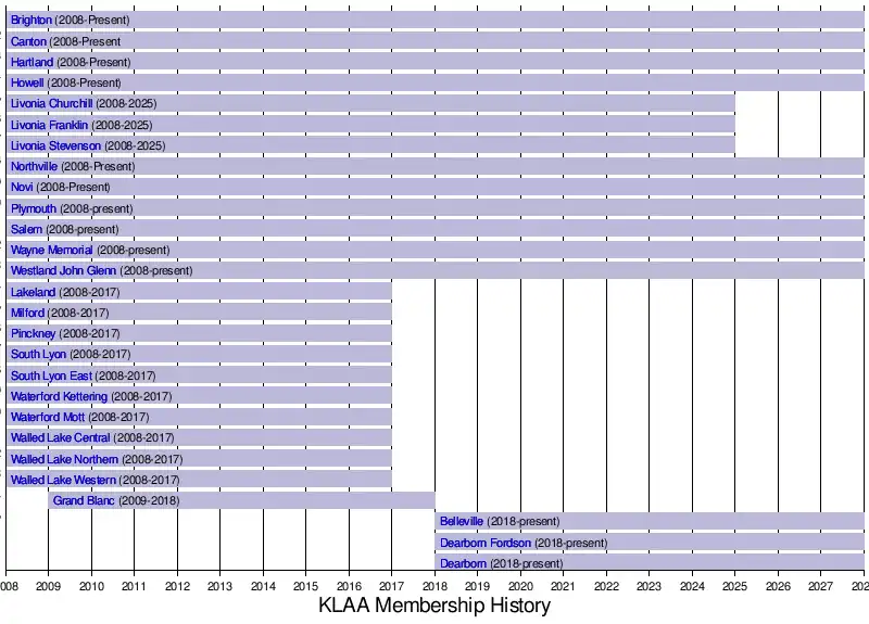 The next day, on March 14, 2017, Grand Blanc was voted out of the KLAA effective for the 2018-2019 school year (due to how isolated it is from the other schools in the division) where it proceeded to join the Saginaw Valley League.[4] In its place, Belleville, Dearborn, and Dearborn Fordson joined the KLAA in 2018.