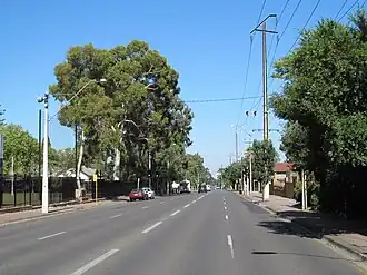 The establishment of Kensington Road dates back to the 19th century, around the time when the Britannia Hotel at its west end was licensed.[4] Its name was derived from the suburbs it traversed — Kensington, Kensington Park and Kensington Gardens.[5] In 1848, St Matthew's Church was established beside the road at Marryatville.[6] By 1855, the first section was gravelled from the Britannia to Sydenham Road.[7] As the road extended eastward in the following years, a creek needed to be diverted.[8] By 1860, the road was graveled until Osmond Terrace.[9] In 1862, a flood event caused severe damage to bridges crossing the creek.[10] In 1864, a proposal was made to widen the road, however it was declined.[11] The road was widened in 1878 under the decision of W. C. Buik.[12] In 1883, the Adelaide & Suburban Tramway Co. opened a horsecar tram line along Kensington Road to a depot at Marryatville, later extending this line to Burnside via Tusmore Avenue[13]