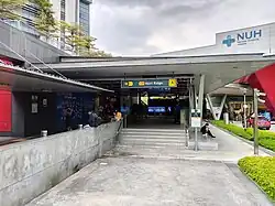 The station is located underneath the National University Hospital (NUH) Medical Centre near the junction of South Buona Vista Road and Kent Ridge Road.[20] The station is at the east of National University of Singapore (NUS) campus.[21] Other landmarks include Singapore Science Park I and Kent Ridge Park.[22] The station serves NUS internal bus shuttle services that connects the station to other areas of the NUS campus.[23]