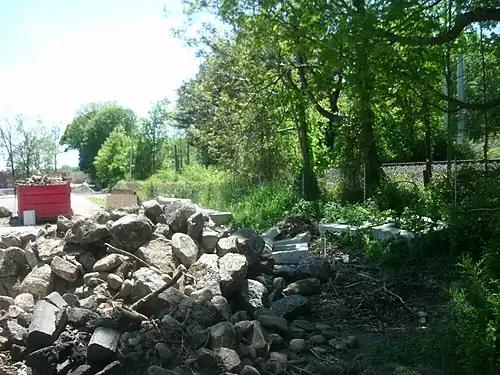 ![]() The former station site of Kent Road, seen behind a pile of concrete and cement blocks in May 2012. | |||||||||||