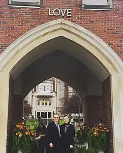 After the Supreme Court ruling in 2015 striking down bans on same-sex marriage across the United States, David Ermold and David Moore, a same-sex couple from Morehead and alumni of Morehead State University, released video footage of the Rowan County Clerk, Kim Davis, refusing to issue them a marriage license under "God's Authority."[26] The video went viral overnight, and it caused an international outrage against the actions of the county clerk. Davis opposed same-sex marriage, but to avoid the appearance of discrimination against gay people, she refused to issue marriage licenses to any couples, opposite-sex or same-sex. In total, six couples, four represented by the American Civil Liberties Union (ACLU), and two couples with separate legal representation, sued Davis in her official capacity as county clerk.[27][28]