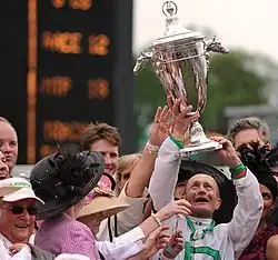 The Kentucky Oaks was first run in 1875; its winner gained a purse of $1,175, but the existing records do not mention any trophy as part of the award ceremony.[1] In 1924 Lemon & Son, Inc. commissioned Redlich & Co. of New York City to create a loving cup, possession of which would signify having won the Kentucky Oaks competition. Redlich asked George Louis Graff to provide an appropriate design. The resulting sterling silver design was 25 inches (64 cm) tall, with horse-head handles on each side and an ornate silver horseshoe on top.