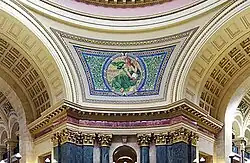 Kenyon Cox began to focus more on mural painting after the 1893 World's Columbian Exposition in Chicago. Cox painted murals in the state capitol buildings of Des Moines, St. Paul and Madison as well as other courthouses, libraries and college buildings.[9] In 1896-97 Cox painted murals in the Library of Congress in Washington, D.C. Cox also made numerous mosaics for places like the Wisconsin State Capitol building.