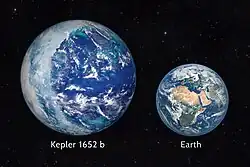 Kepler-1652b (also known by its Kepler Objects of Interest designation KOI-2626.01) is a super-Earth exoplanet, orbiting within the habitable zone of the red dwarf Kepler-1652 about 822 light-years away in the Cygnus constellation. Discovered by NASA's Kepler spacecraft, Kepler-1652b was first announced as a candidate in 2013, but wasn't validated until four years later in 2017. It is a potential super-Earth with 160% Earth's radius. The planet orbits well within the habitable zone of its system, the region where liquid water can exist on a planet's surface.[1] The planet is an eyeball planet candidate.[2]