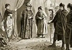 As early as 1371 when Ivan Alexander died and Ivan Shishman inherited the throne, in the capital Tarnovo arrived ambassadors from the Ottoman Sultan Murad I to arrange his relations with the new Emperor of Bulgaria. The Sultan who was obviously familiar with the beauty of Kera Tamara and the fact that she was a widow demanded her to become his wife as a guarantee for the peace between the two counties.[2] Ivan Shishman managed to divert his demand and prolonged his decision for seven years. On that occasion an anonymous Bulgarian chronicle from the 15th century records: