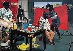 Marshall is one of the members of the contemporary artists of color such as Mickalene Thomas, Howardena Pindell, Charlene Teters, and Fred Wilson, who often incorporated the issue of race into their work. Marshall's work is steeped in black history and black popular culture embracing blackness as a signifier of difference to critically address the marginalization of blacks in the visual sphere, utilizing a wide range of styles.[19] His artworks are identity-based; specifically, he made black aesthetics visible and brought the black aesthetic into the fold of the grand narrative of art. In his own words, he uses blackness to amplify the difference as an oppositional force, both aesthetically and philosophically. One such "black" issue Marshall takes up is that of beauty. He stated that since most figures in advertising are white, he wanted to produce images of black bodies to "offset the impression that beauty is synonymous with whiteness"[8] "Black is beautiful" was one of the Black Arts movement's slogans to counter the prevailing view that blackness was inherently unattractive. Marshall directly appropriates the slogan in some of his works by utilizing language.[19] Along with "Black is beautiful", he wanted to create an epic narrative in his paintings in the "grand manner".[8] His focus was to create new works of art that were not a part of the western art-historical tradition.