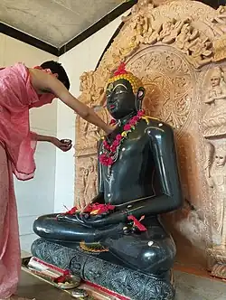 The idol is considered miraculous and according Jain belief praying to the idol fulfills the wishes of devotees.[16][17] The saffron and garland is profusely applied to the idol for worship.[15][18][19] The replicas of Kesariyaji Rishabhanatha is popular among Śvētāmbara murtipujaka. According to Jain belief, worshipping these local replication idols allow them to directly worship to the original idol.[20]