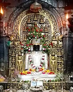 The temple is considered an important pilgrimage center by both Digambara and Śvētāmbara sect of Jainism and Hindus.[1][3][12] The mulnayak of the temple is a 1.05 metres (3 ft 5 in) black stone idol of Rishabhanatha, revered by both Vaishnavas and Jains.[5][2] Kesariyaji is the name of Rishabhanatha idol inside the temple. The name is derived from the instance of a man of offering kesar (transl. saffron[13]) equal to his son's weight when his wish of having a child is fulfilled.[14] According to another legend, a Brahmin once threw a coin at idol saying "if you have any strength you will show it me", the coin flew back hit Brahmin head.[15]