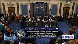 On April 7, 2022, the Senate invoked cloture on her nomination by a 53–47 vote with the same senators voting "yea".[70] She was subsequently confirmed by the same margin with once again the same senators voting "yea", announced by Vice President Kamala Harris.[71]