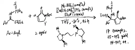 In 2016, direct asymmetric catalytic Mannich reaction of an alpha, beta-unsaturated gamma-butyrolactam with ketiminoesters was proposed by Kumagai el al. using soft Lewis acid/hard Brønsted base cooperative catalysis. (scheme 22)[17] As a result, alpha-addition products were synthesized from alpha,beta-unsaturated gamma-butyrolactams onto ketimines through asymmetric catalysis, which is a novel catalytic asymmetric reaction. The corresponding phosphinoyl protected ketiminoester did not react without the cooperative catalysis by the soft Lewis acid / hard Bronsted base, which means the interaction between copper catalyst (as soft Lewis acid) and thiophosphinoyl protecting group of ketimines (as soft Lewis base) is significant for this successful Mannich reaction.