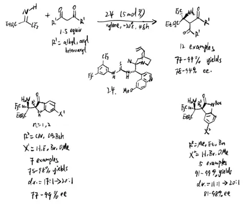 - ^ Homma, Chihiro; Takeshima, Aika; Kano, Taichi; Maruoka, Keiji (2021). "Construction of chiral α-tert-amine scaffolds via amine-catalyzed asymmetric Mannich reactions of alkyl-substituted ketimines". Chemical Science. 12 (4): 1445–1450. doi:10.1039/d0sc05269h. ISSN 2041-6520. PMC 8179053. PMID 34163907. S2CID 229395873.