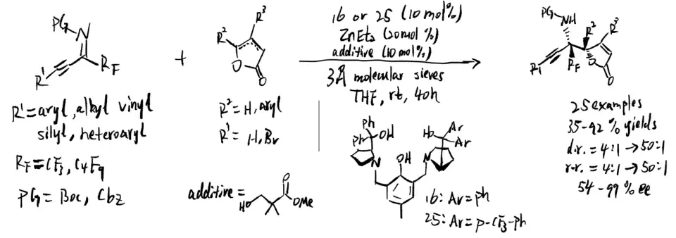 In 2018, Zn-ProPhenol was used to catalyze asymmetric Mannich reaction of butenolides with perfluoroalkyl alkynyl ketimines, which is proposed by Trost et al. (scheme 24)[19] Several features about this reaction were reported: 1. Ketimines are more electrophilic, resulted by fluorinated groups 2. Alkyne group has less steric effect, and its high s character makes ketimines more electrophilic 3. Steric difference between alkynyl and perfluoroalkyl groups would give ketimines in a single diastereomeric form, which is critical for high stereoselectivities. The reaction is broad in scope, which allows further contribution in medicinal field and synthetic chemistry.