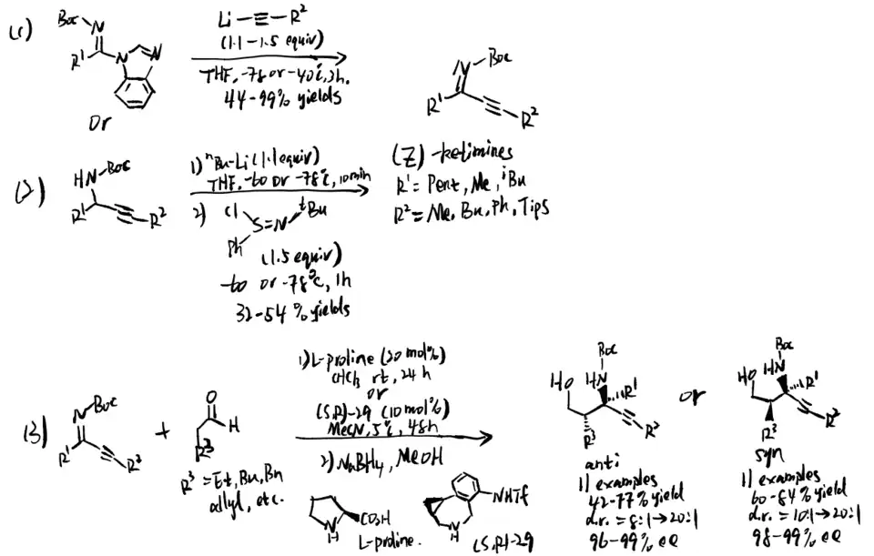 It is hard to control E/Z selectivity for ketimines having two structurally similar substituents, which makes such kind of ketimines merely used in asymmetric catalysis field comparing to ketimines that have single diastereomeric form. In 2021, Kano et al. proposed method to use alkynyl ketimines as synthetic equivalents of dialkyl ketimines, and dialkyl ketimes are a typical example of isomeric ketimine mixtures. The alkynyl groups can be reduced by hydrogenation back to corresponding alkyl groups. Moreover, a single diastereomeric alkynyl alkyl N-protected ketimines can be obtained by using steric difference between alkyl and alkynyl group, which makes them be stereoselectively controlled by chiral catalyst to give asymmetric Mannich product. Additionally, small steric hindrance and high s character of alkynyl group result in its high nucleophilicity, making alkynyl-substituted ketimines more reactive than alkyl counterparts. Even though additional step of hydrogenation is needed, the advantages provided by alkynyl group are still impressive. To solve the problem that a single diastereomeric form of N-Boc alkyl alkynyl ketimines are difficult to access, Kano et al. proposed a synthesis to form these ketimines (reaction 1 and 2), followed by operating chiral amine-catalyzed Mannich reactions (reaction 3). (scheme 26)[21] The chiral amine catalyzed the asymmetric Mannich reaction of aldehyde and (Z)-alkyl alkynyl ketimines. The method they used is stereodivergent, in which the phenylcyclopropane amine 29 gives syn products, and the proline catalyst gives anti product. After the hydrogenation step, they successfully obtained chiral amines substituted with two similar alkyl groups, which is hard to obtained in a single enantiomeric compound.
