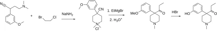 Ketobemidone is 1-methyl-4-(3-hydroxyphenyl)-4-propionylpiperidine. It is usually available as the hydrochloride, which is a white powder. It is synthesized by alkylating (3-methoxyphenyl)acetonitrile with bis(2-chloroethyl)methylamine, followed by reaction with ethylmagnesium bromide, and finally O-demethylation with hydrobromic acid.[11]