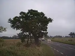 Kett was about 57 years old and was one of the wealthier farmers in Wymondham. The Ketts (also spelt Ket, Cat, Chat, or Knight) had been farming in Norfolk since the twelfth century. Kett was the son of Thomas and Margery Kett and had several brothers; clergyman Francis Kett was his nephew. Two or possibly three of Kett's brothers were dead by 1549, but his eldest brother William joined him in the rebellion.[6] Kett's wife, Alice, and several sons are not recorded as having been involved in the rebellion.[7] Kett had been prominent among the parishioners in saving their parish church when Wymondham Abbey was demolished and this had led to conflict with Flowerdew.[8] Having listened to the rioters' grievances, Kett decided to join their cause and helped them tear down his own fences before taking them back to Hethersett where they destroyed Flowerdew's enclosures.[9] The following day, Tuesday 9 July, the protesters set off for Norwich. By now Kett was their leader and they were being joined by people from nearby towns and villages.[10] A local tradition holds that a meeting point for the rebels was an oak tree on the road between Wymondham and Hethersett, where nine of the rebels were later hanged. Known as Kett's Oak, it has been preserved by Norfolk County Council.[11][12] The oak became a symbol of the rebellion when an oak tree on Mousehold Heath was made the centre of the rebel camp, but this "Oak of Reformation" no longer stands.[13] According to one source the Oak of Reformation was cut down by Norwich City Council in the 1960s to make way for a car park,[14] although Reg Groves wrote in the 1940s that it had already been destroyed.[15]