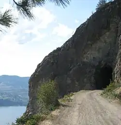 One of the most popular sections of the hiking trail along the former Kettle Valley Railway line is the section through Myra Canyon.[3] Myra Canyon is located south of Kelowna on Okanagan Mountain. The section of line originally transited between Midway and Penticton. When the railway was built, the section of railway between Myra station and June Springs station required 18 wooden trestles and two tunnels in order to traverse the deep canyon.