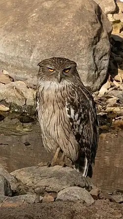 The brown fish owl is an all-year resident throughout most tropical and subtropical parts of the Indian Subcontinent to Southeast Asia and adjoining regions. West of its main range, it is patchily distributed to the Levant (possibly extinct) and southern Asia Minor (recently rediscovered). The typical habitat of brown fish owls is forest and woodland bordering streams, lakes or rice fields. It inhabits mainly the lowlands, from open woodland to dense forest as well as in plantations; in the Himalayas foothills it ranges into submontane forest up to 1,500 m (4,900 ft) above mean sea level or so but not higher. It frequently spends the day in stands of bamboo or other large shady trees. They be found around water reservoirs, along canals, on the outskirts of villages and along sea coasts. Western birds are found in semiarid landscape and may breed in oases in arid regions. Regardless of habitat, it rarely strays far from larger bodies of water such as rivers and lakes.[16][20][19] Being a large predatory bird, the brown fish owl is only rarely found at a high population density, an exception being Sri Lanka, where this particular owl's adaptability to human habitat change has been beneficial in continued high numbers.[15]