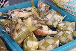 Further east, in the Mariana Islands, the Chamorro people prepare katupat, a diamond- or square-shaped rice pouch woven from coconut fronds and boiled until compact. Archaeological and linguistic evidence suggests that both rice cultivation and katupat production were established before Spanish colonisation in the seventeenth century.[17][18] Closely resembling ketupat, this tradition reflects the deep Austronesian roots of leaf-wrapped rice practices. Early Spanish records also highlight the craftsmanship of Chamorro women in weaving coconut leaves into both decorative and utilitarian items, including katupat containers.[19][20]