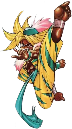 Kevin was created for Trials of Mana, his design finalized by manga and anime artist Nobuteru Yūki based on concept art by Koichi Ishii. He was meant to evoke the idea of a "slightly evil version of Son Goku" from Dragon Ball, intentionally made to be the only dark-skinned character in the party. His design combines Arabian clothing and a tanran blazer, "that a yougn Japanese hooligan would wear." He wears a boa and zebra-stripe pants to convey his Beastman race. His hat was made to look like a Green Beret's.[1] His design in the remake was created by the artist HACCAN.[2] He was included in the game due to the team wanting a transforming character.[3] He was intended to have romantic moments with another playable character, Charlotte, which ultimately had to be left out due to a lack of space.[4] In the remake, scenes between Kevin and Charlotte were added.[5]