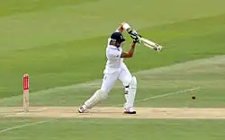 In 2000, Nottinghamshire coach Clive Rice, who had seen Pietersen play in 1997 in South Africa at a schools week, heard that Pietersen was playing club cricket for the Cannock Cricket Club and offered him a three-year contract to play for the county.[26] His maiden first-class century came on his Nottinghamshire debut against Loughborough UCCE.[50] In his first season, he made 1,275 runs with an impressive batting average of 57.95,[51] including 218 not out in an unbroken sixth-wicket stand of 352 with John Morris at Derby in July, after having been out lbw for a duck in the first innings.[52] These performances led to praise in the Wisden Cricketers' Almanack: "If he can maintain his first season's form, the name of Pietersen should be pencilled in for future Test squads."[51] This form did indeed continue into the following year: he made another unbeaten double-century, against Middlesex, taking part in a partnership of 316 for the fourth wicket with Darren Bicknell.[53] This period proved to be a purple patch for the batsman, scoring four consecutive centuries (254 not out, 122, 147 and 116) in one week in August.[54]