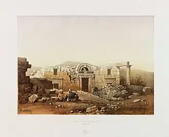 As these remains were the first of the kind that we had yet seen; and were of a style of architecture utterly unknown to us; we were at a loss for some time what to make of them. They were evidently neither Greek nor Roman. The inscription, if authentic, obviously marks both structures as of Jewish origin; and as such, they could only have been synagogues. We were, however, not satisfied on this point, until we found at Meirôn the same species of architecture, in the acknowledged remains of an ancient Jewish synagogue. We afterwards found the ruins of like structures at Irbid, Tell Hum, Kedes, and perhaps other places in Galilee; all marked with the same architectural peculiarities. The size, the elaborate sculptured ornament, and the splendour of these edifices, do not belong to a scattered and down-trodden people; such as the Jews have been in these regions ever since the fourth century. These costly synagogues, therefore, can be referred only to the earlier centuries of the Christian era; when Galilee was the chief seat of the Jews; and Jewish learning and schools flourished at Tiberias. All these circumstances would seem to mark a condition of prosperity and wealth and influence among the Jews of Galilee in that age, of which neither their own historians, nor any other, have given us any account.[7]: 71