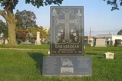The gravestone was designed by Leo Hanian, an ethnic Armenian who fled persecution from Azerbaijan.[1] The gravestone is designed in an Armenian khachkar style and is made out of Indian black granite with a depiction of an ornate Cross. The gravestone carries Garabedian's name and dates of birth and death along with two images of the Independence Hall of Philadelphia and the Cathedral of Holy Etchmiadzin in Armenia.[1] The lower part of the tombstone describes his life in detail with an image of the USS Grand Gulf and a 35-star U.S. flag.[1]