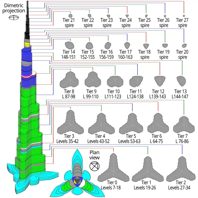 The design is derived from Islamic architecture.[22] As the tower rises from the flat desert base, there are 27 setbacks in a spiral pattern, decreasing the cross-section of the tower as it rises and creating convenient outdoor terraces. These setbacks are arranged and aligned in a way that minimizes vibration wind loading from eddy currents and vortices.[7] At the top, the central core emerges and is sculpted to form a finishing spire. At its tallest point, the tower sways a total of 1.5 m (4.9 ft).[41]