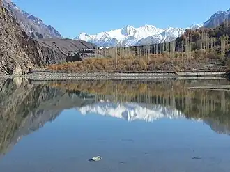 Khalti Lake is located in Khalti Village of Gupis-Yasin District (Gilgit-Baltistan), Pakistan at about 2,217 metres (7,274 ft) above sea level. The lake is known for its habitat of trout fish. The lake is in a bend of the Ghizer River near the village of Khalti. Khalti Lake is known for its stock of trout.[5] Originally, the trout was put into the River Ghizer near Golaghmuli Village. Those fishes increased in number and reached almost every part of Gupis Valley.