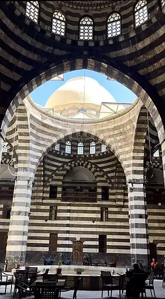 Khan As'ad Pasha (Arabic: خَان أَسْعَد بَاشَا, romanized: Khān ʾAsʿad Bāşā) is the largest caravanserai (khān) in the Old City of Damascus,[1] covering an area of 2,500 square metres (27,000 sq ft). Situated along Al-Buzuriyah Souq, it was built and named after As'ad Pasha al-Azm, the governor of Damascus, in 1751–52.[2] Khan As'ad Pasha has been described as one of the finest khans of Damascus,[3] and the most "ambitious" work of architecture in the city.[4]