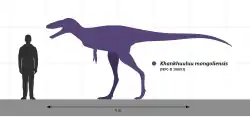 Khankhuuluu is a medium-sized tyrannosauroid. None of the known specimens preserve a complete skull. However, the cranial bones of the two more complete specimens, MPC-D 100/50 and MPC-D 100/51, suggest a total skull length between 60 and 70 centimetres (24–28 in) long. MPC-D 100/51 is slightly smaller than the holotype and has a femur 66.8 centimetres (26.3 in) long. Both specimens likely belong to mature individuals. Sexual maturity is suggested by the development of ornamentation on the nasal and lacrimal. Skeletal maturity is implied by the close of the neurocentral sutures of the dorsal vertebrae, as well as the interdigitating frontal sutural surface of the postorbital.[2] Estimates suggest Khankhuuluu was around 2 m (6.6 ft) tall at the hips and at least twice that in length. It may have weighed around 750 kg (1,650 lb). Khankhuuluu is notable as it illuminates the evolutionary patterns of tyrannosauroid dinosaurs. While some of its anatomical characteristics are more reminiscent of earlier-diverging species, many other features more closely resemble later members of the Tyrannosauridae.[7]