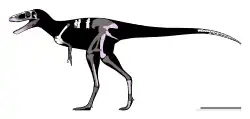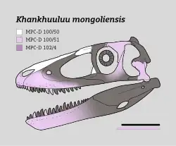 Khankhuuluu (/xɑːnˈxuːluː/ khahn-KOO-loo; lit. 'dragon prince')[1] is an extinct genus of early tyrannosauroid theropod dinosaurs from the Late Cretaceous of what is now the Gobi Desert in Mongolia. The genus contains a single species, Khankhuuluu mongoliensis, known from several skull bones and two partial skeletons, including shoulder, pelvic, and hindlimb bones, and several vertebrae from the back and tail. The remains were discovered in 1972 and 1973 and first described in 1977 as belonging to the Chinese Alectrosaurus. Later researchers recognized the uniqueness of the bones, and they were eventually named as belonging to a new species in 2025. Khankhuuluu is a medium-sized tyrannosauroid with a shallow skull and long, slender legs. Its skeleton demonstrates a unique combination of anatomical traits seen in both earlier-diverging (basal) tyrannosauroids and the later-diverging (derived) tyrannosaurids.
