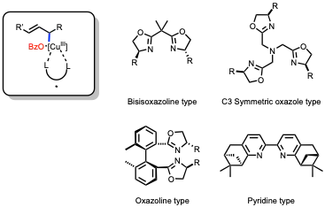 Since the reaction usually generates a stereogenic center, multiple asymmetric variants of this transformation have been developed.[7] To achieve the stereoselectivity, employing bidentate chiral ligand into the reactions is the most common strategy, inducing the asymmetric formation of benzoate often relies on the ability of the ligand and Cu(III). Some examples of frequently used ligands are oxazolines,[8] pyridines,[9] and C3 symmetric oxazoles.[10]