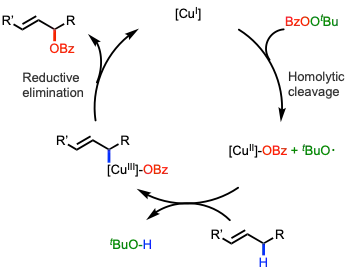 Although the mechanism of Kharasch-Sosnovsky oxidation is not fully understood, the general aspects have been established. The reaction is known to undergo a radical mechanism. Taking the most representative reaction as an example, most of the studies suggest that the Cu(I) and perester complex can go through a homolytic dissociation of the perester through coordination of a Cu(I) salt, leading to the formation of a Cu(II) complex and tert-butoxyl radical. However, the mechanism of Cu(II) to Cu(III) remains unknown. Several mechanistic studies hypothesize it can undergo multiple steps to generate the allyl- Cu(III) key intermediate.[6] In the final step, the C-O bond formation between the alkenyl and benzoate occurs through the reductive elimination of the copper(III) complex.