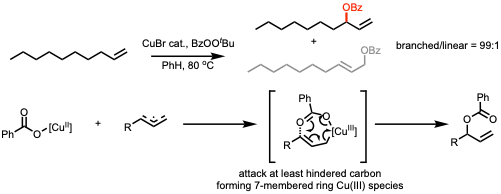 Since the early 20th century, the scientific community has been aware of the oxidation of allylic C-H bonds. This reactivity can be attributed to the weakening strength of allylic and benzylic C-H bonds by approximately 16.4-16.7 kcal/mol,[11] compared to a regular C-H bond. In the late 1950s, Kharasch—Sosnovsky oxidation was developed. Since then, there have been multiple studies employing first-row transition metals (especially copper)-mediated reactions to install functional groups in the allylic position.