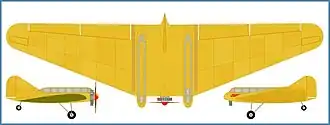 Its wing center section was rectangular in plan, with a steel tube four spar structure and dural skinning. It had a chord of 5.0 m (16.4 ft) and a chord/thickness ratio of 14%. The outer panels making up 82% of the span, were all-wood with dihedral and 16° of sweep on the leading edge only. The panels decreased in thickness outwards from 14% to 7%, with 8° washout. Each wing carried three control surfaces. Near each tip, at midchord and parallel to the leading edge there was a rectangular air brake which were operated differentially by pedals which also controlled the rudder to assist in making turns. Inboard of the air brakes, each outer panel trailing edge carried two broad-chord control surfaces that acted as both ailerons and elevators.[1]
