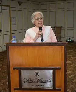 She has over 60 publications to her credit, and her research, writing, and lecturing have focused on women and development, feminism, politics, the economic and environment challenges facing women, and sexual and reproductive health.[13] She has been serving as a member of governing body and board of directors of national and international organizations,[14] including as vice-president of International Union for the Conservation of Nature, and the Society for International Development,[15][16] ARROW, UNEP International Resource Panel, the Punjab Rural Support Programme, and the PANOS South Asia,[17] and Lead Pakistan.[10] She contributed to the development of Pakistan's national conservation strategy, and represented West Asia on the International Union for Conservation of Nature Council (IUCN).[18] She sits on the board of directors of the International Institute for Sustainable Development (IISD) as well as the editorial panel of the Society for Development's journal, Development.[4] She has served as the member of the International Institute for Sustainable Development (IISD) as well as the editorial panel of the Society for Development's journal, Development,[4] Working Group of Pakistan's Planning Commission on Economy, Poverty and Sustainable Agriculture,[19] and Pakistan Poverty Alleviation Fund (PPAF).[20]