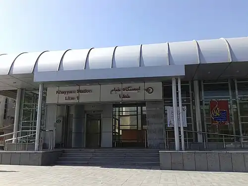 Khayyam Metro Station is a station on Tabriz Metro Line 1. The station opened on 27 August 2015. It is located next on Bakeri Boulevard at Khayyam Square near Rajaeishahr neighbourhood. It is between Emam Reza Metro Station and 29 Bahman Metro Station.