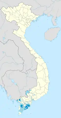 The Khmer Krom (Khmer: ជនជាតិខ្មែរក្រោម, Chónchéatĕ Khmêr Kraôm, [cɔnciət kʰmae kraom]; lit. 'Lower Khmer people' or 'Southern Khmer people') are ethnically Khmer people living in or from the Mekong Delta (Tây Nam Bộ), the south western part of Vietnam known in Khmer as Kampuchea Krom (Khmer: កម្ពុជាក្រោម, Kâmpŭchéa Kraôm [kampuciə kraom] lit. 'Lower Cambodia'). The Khmer Krom people are considered as the indigenous people of parts of Southern Vietnam and have the oldest extant recorded history of inhabiting in the region.[4] In Vietnam, they are recognized as one of Vietnam's fifty-three ethnic minorities.