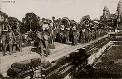 The majority of the Cambodians live in rural villages either as rice farmers or fishermen. Their life revolves around the Wat (temple) and the various Buddhist ceremonies throughout the year. However, if Cambodians become ill, they will frequently see a kru khmae (shaman/healer), whom they believe can diagnose which of the many spirits has caused the illness and recommend a course of action to propitiate the offended spirit, thereby curing the illness.[52] The kru khmae is also learned in herb lore and is often sought to prepare various "medicines" and potions or for a magical tattoo, all believed to endow one with special prowess and ward off evil spirits or general bad luck.[52] Khmer beliefs also rely heavily on astrology, a remnant of Hinduism. A fortune teller, called hao-ra (astrologists) or kru teay in Khmer, is often consulted before major events, like choosing a spouse, beginning an important journey or business venture, setting the date for a wedding and determining the proper location for building new structures. Throughout the year, the Cambodian celebrate many holidays, most of a religious or spiritual nature, some of which are also observed as public holidays. The two most important are Chol Chhnam (Cambodian New Year) and Pchum Ben ("Ancestor Day"). The Cambodian Buddhist calendar is divided into 12 months with the traditional new year beginning on the first day of khae chaet, which coincides with the first new moon of April in the western calendar. The modern celebration has been standardized to coincide with April 13. Dance occupies a central place for the Khmer people, one of its earliest records dates back to the 7th century, where performances were used as a funeral rite for kings.[53] In the 20th century, the use of dancers is also attested in funerary processions, such as that for King Sisowath Monivong. During the Angkor period, dance was ritually performed at temples.[54] The temple dancers came to be considered as apsaras, who served as entertainers and messengers to divinities.[55] Ancient stone inscriptions describe thousands of apsara dancers assigned to temples and performing divine rites as well as for the public.[54] The Khmer classical dance was placed in 2003 on the UNESCO World Heritage List.