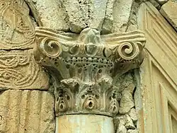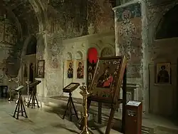 Khobi is a domeless hall church, with cross-vaults. The northwestern and southwestern corners had been assigned to individual chapels (eukterion), but later both of these were connected to the central bay. The entire length of the western and southern facades is flanked by an open gallery, which terminates in a closed chapel at the eastern end of the south facade. The facades are decorated with carved stonework. The internal walls adorned with a set of frescoes from the 13th–14th century—influenced by the late Byzantine Palaeologan art—and the 17th century. Apart from the religious paintings, there are frescoes depicting members of the Dadiani family, with Georgian inscriptions.[2] A lengthy inscription on the southern chapel, in the medieval Georgian asomtavruli script, relates that a large collection of marble columns, capitals and fragments of the ambo was brought by Vameq I Dadiani (died 1396) from his victorious campaign against Zichia. These pieces of stonemasonry, some of them of Byzantine origin and dating from the 5th century, are used to decorate the walls of the chapel.[3] Not far from the main church, there is a 14th–17th century bell-tower, ruins of a 17th century episcopal palace, and remains of a circuit wall, restored in a government-run project in 2016.[4]