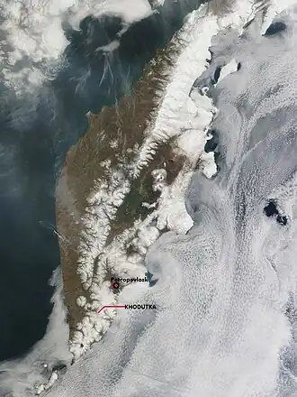 ![]() Space image of Kamchatka Peninsula, showing location of Khodudka | |