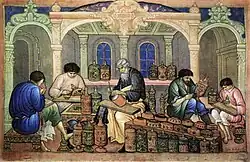 The production of painted dishes in Khokhloma is first mentioned in 1659 in the letter of a boyar called Morozov to his bailiff, containing an order for the following: "One hundred painted dishes polished with powdered tin, both large and medium, of the very same kind possessed by us earlier, not forgetting twenty large painted wine bowls, twenty medium, and twenty somewhat smaller".[3]