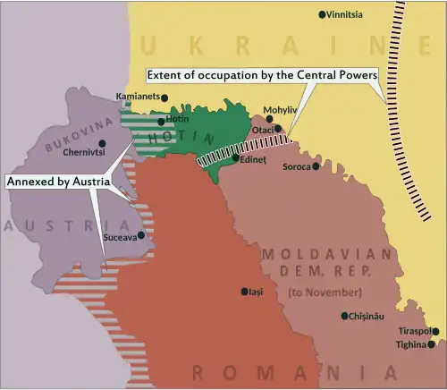 On March 3, the Treaty of Brest effectively meant that the UNR renounced its claims in northern Bessarabia to Austria.[31] The former Khotinsky Uyezd was occupied by the Royal Hungarian Honvéd, on behalf of Austria, that same month. Hungarians controlled the county down to (and including) Ocnița, as well as the northern extremity of Soroca County; under the terms of an armistice, the Romanian Army held on to the remaining areas, including 8 villages in Hotin.[32] Early the following month, the Bukovinan Romanian Ion Nistor invited civilians, including those of Hotin, to "stand guard on the old border, as your grandparents and ancestors before you".[33] On April 14, 1918, Romanian and RDM officials set up a border crossing at Otaci, east of Hotin area and further downstream on the Dniester.[34] UNR–Romanian relations grew more hostile over those days, with rumors emerging that the Ukrainian side had formally protested against the Romanian presence in Bessarabia.[35]