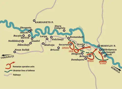 Romanian Army historian Ion Giurcă sees Davidoglu as ill-suited for the task of maintaining order, in that he failed to anticipate the subsequent incursion.[71] Stănescu similarly notes that Davidoglu and his aide, Colonel Carol Ressel, "did not consolidate [their] positions", despite being informed of troop movements near Mohyliv.[72] On January 19, Podolian irregulars crossed into Hotin County at Atachi, disarming Romanian border guards and moving in on Soroca.[73] Historian Wim van Meurs describes this attempt as "Bessarabian peasants [...] attempt[ing] to capture the bridge across the Dniester in order to smuggle arms into Bessarabia."[74] These reinforcements succeeded in taking over a string of villages, including Arionești, Codreni, Naslavcea, Pocrovca, and Rudi; on January 23, after reaching Secureni, rebellion erupted in Khotyn itself, chasing out the Romanian garrison.[75]
