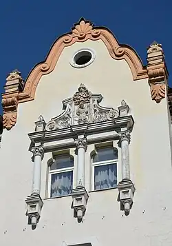 The building has a complicated shape with a central tower with a spire looking at the street crossing. The walls are white, except for two large paintings made of maiolica. There are many details, including arches and windows, which are clearly inspired by real or imaginary architecture of the Zaporizhian Sich.[1]