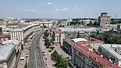 Khreshchatyk began to be developed in the 1830s and 1840s, beginning from the European Square end. Its current design emerged in 1837 when it was planned as Kyiv's principal street by architects that included the city architect, Ludvik Stanzani.[6] From 1868 banks started to be located on Khreshchatyk. The Kyiv Stock Exchange was built in 1869. The thoroughfare became one of the most famous in the Russian Empire.[7] The new City Hall was built on the street in 1874–1876. Other notable buildings constructed during this period were the Merchants' Hall, the concert hall, the Central Post Office, and the Club for Polish Noblemen. During the 1880s, its wooden-built restaurants and taverns were being replaced by stone-built multi-storey houses and shops. The street, with its departmental stores and hotels, was called "the only real street in Kiev," and, along with the city’s larger churches, became its central modern attraction for visitors.[5]