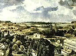 Prior to the 1830's, Khreshchatyk wasn't a street, it was a rural area of rolling hills called the Khreshchatyk Valley. The true emergence of Khreshchatyk Street is traditionally dated to 1797, but even then, there was no street here. That year, a contract fair, previously held in the city of Dubno, was relocated to Kyiv and organized for the first time on the site of present-day Khreshchatyk. At the time, the area was largely undeveloped, making it well-suited for large public gatherings. It was at the intersection of Kyiv’s three principal historical districts: Old Kyiv, Podil, and Pechersk.[6][7]
